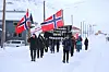 Med klassiske paroler som Nei til sosial dumping og Trygt arbeidsliv marsjerte det vesle toget ned Vei 500. Foto: Kåre M. Hansen Stille tog gjennom byen Publisert 01.05.2025 - 21:10 Sist oppdatert 02.05.2025 - 00:12 1. mai turistdestinasjon longyearbyen arbeiderbevegelsen nyheter gruve 7