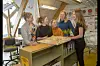 Arkitektene er opptatt av gjenbruk av byggematerialer både i egne kontorlokaler og i utstillingsprosjektet de presenterte fredag under åpningen. Den brukte hyllebaren de står ved har fått nye eikeplater på toppen. Fra venstre Sigrid Feiner-Endresen, Ingvild Sæbu Vatn, Lilli Wickström, Anne Sandnes og Silja Nordvåg.