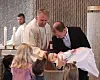 Døpefonten: Her blir seks måneder gamle Milda døpt av soknepresten Odd Bjarne Ellefsen i Grim Kirke på sørlandet. Mens pappa Bjørn-Arild Schancke holder henne over døpefonten heller soknepresten vannet fra Arktis og sørlandet på hodet til lille Milda.