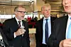 Sysselmann Odd Olsen Ingerø råder Nærings- og fiskeridepartementet om å overta eiendommen som nå er til salgs. Her er han i samtale med Avinor-sjef Dag Falk-Petersen under åpningen av ny hangar på Svalbard lufthavn Longyear i slutten av april.