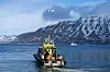 NIS «Professor Molchanov» (blå og hvit båt) kom inn til Longyearbyen mandag. Her er losbåten «Elling Carlsen» på vei ut.
