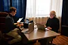 Kontordag med Sysselmesteren til Barentsburg 27. september 2024. Skattesjef Solveig Winther Fosvold og rådgiver Kristian Strømnes registrerer innbyggerne i Barentsburg i bostedsregisteret for Svalbard.