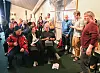 HØY TEMPERATUR: Noen var sinte og frustrerte, andre tok lettere på det. Barneos ekspedisjonskoordinator Viktor Voyarskij, i burgunder genser til høyre, forklarte og svarte på spørsmål etter beste evne.