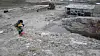 Benjamin Koster jobber med å undersøke grunnen ved bruddet fra 1912. I bakgrunnen ses driftsbygningen og deler av maskineriet som ble brukt da Northern Exploration Co. drev marmorutvinningen.