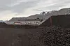 Flere tonn med tørt, fint, mørkt kull rasler ned og legger seg sammen med den allerede påbegynte haugen.