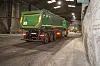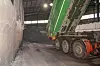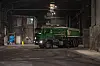 En grønn lastebil kjører kullet inn i fabrikkens lagerhall. Den er en av opptil 26 biler som er innom daglig. Foto: Tare Reklev Øverbø