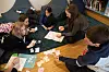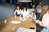 Helle Helmersen, Sofie Maudal, Ada Myren, Erika Winther Dahl og Frøya Myhren var her i gang med et spill hvor det var om og gjøre å få koppen til å lande med åpningen ned, flest ganger, på 10 minutter. For hver gang de klarte det, måtte de sette strek på papiret. Til slutt skulle alle strekene telles opp.Foto: Anja Charlotte Markussen