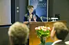Pernilla har ristet av seg de verste nervene, og er godt i gang med å forklare hva hennes forsking i arktiske strøk har frembragt av ny viten. I forgrunnen skimtes hodene til to av opponentene i disputasen hennes på Unis sist uke.