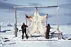 Historisk bilde: Overvintring i Hornsund i 1966/67 Stort isbjørnskinn opphengt i stativ. Fra Einar Sletbakk og Terje Ovliens overvintring. Foto: Fra Einar Sletbakks samling, på utlån fra Svalbard Museum Publisert 25.01.2025 - 11:00 historisk bilde historisk svalbard museum fotoarkiv nyheter