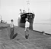 Bergstudentene Felix Eckert (t.v.) fra Tyskland og Viktor Weiss fra Østerrike har ventet i to uker på båtskyss til Svalbard. 14. juli 1954 siger «Jacob Kjøde» for sakte fart inn mot kaia i Harstad.