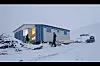 Einar Jenssen (t.v.) får hjelp til å bære inn plater til gulvet i hytta. Nesten alt av den gamle hytta som ble tatt av skred i fjor sommer er revet og bygget opp igjen.