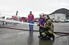 Eva Helen Hultgren (6) får instruksjon i bruk av brannslange av brannmann Odd Rune Svenning.