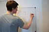 Rasmus Bøckman er leder for fjernvarme i Svalbard Energi. Han tegner og forklarer hvordan man varmevekslerene fungerer og hvordan Longyearbyen kan spare masse energi ved å kutte mengden vann som må pumpes gjennom systemet med en tredel.Foto: Line Nagell Ylvisåker