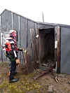 Totalsmadret: Dette bildet av døra til SAR-hytta på Heimland viser hvordan bjørnen har ødelagt døra for å ta seg inn. Døra er nå restaurert og skal remonteres ila sommersesongen 2022.