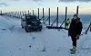 540 METER: Stasjonssjef Maja-Stina Ekstedt ved Svalsat foran omtrent halvparten av det 540 meter lange snøgjerdet som er under konstruksjon for å sikre veien i fjellsiden nedenfor.