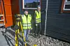 Pavel Kotov (t.v.) og Anatoly Sinitsyn ved Unis Guest House, ett av de to byggene de har målt bevelgelsene på de siste to årene. De er overrasket over hvor mye byggene har sunket på så kort tid.