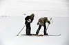 Elias Damli (t.v.) og Johannes Breivik kjemper seg framover iført ski og utstyr fra Nansens dager. Ungdommene skal bruke dette utstyret når de går den siste breddegraden inn mot Nordpolen. TV-serien blir sendt neste vinter på NRK Super.