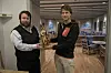 Malte Jochmann, til høyre, overrekker St. Barbara til organist og kirkemusiker Jovna Z. Dunfjell i Svalbard Kirke, på vegne av bergmannsforeningen i Peissenberg og Store Norske Mandskor. Skytshelgenen skal stå på hyllen til venstre bak Dunfjell.