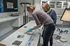 Svalbard Museum har fått 32 akvareller som Christiane Ritter malte da hun overvintret på Gråhuken i 1933 til 1934. Registrator Katja Eklund pakker forsiktig ut bildene mens konservator Herdis Lien bivåner. Nederst på bordet ligger panoramaet Christiane malte av utsikten fra hytta de overvintret i.