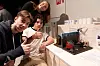 Fra venstre: Kristian F. Onarheim, Albert Moen og Elvira A. Søreng (bak) er tre av totalt åtte elever som har stått for delen av prosjektet som skulle ta for seg tiden før og etter krigen. De hadde derfor laget en modell av Longyearbyen, som de var ganske fornøyde med.