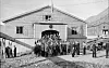 Pent kledde arbeidere på vei inn i Stormessa trolig tidlig på 1950-tallet.Foto: Herta Grøndal/Grøndal foto
