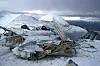 En vrakdel på toppen av Operafjellet. Sammenstøtet har vært voldsomt i det flygerne har prøvd å unngå fjellsiden, gitt pådrag og forsøkt å vinne høyde. I bakgrunnen ser vi Helvetiafjellet, og noen meter lenger fram er den bratte skrenten ned til Koslådalen.