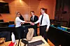 Statsadvokat Kristin Røhne hilser på forsvarer John Christian Elden og medforsvarer Bernt Heiberg (i midten) før rettsaken mot den dronetiltalte russeren Andrey Yakunin i Nord-Troms og Senja tingrett tirsdag morgen.
