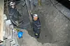 Tømrerne Peter Worschech (t.v.) og Frank Pettersen fra Bergen jobber med å skifte ut et råtnende fundament på den 24 meter høye taubanebukken. Selv om det er kaldt og mørkt, trives bergenserne med de uvanlige oppgavene.