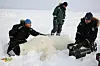 Ingeniør Magnus Andersen i NP måler fettprosent hos en isbjørn (akkurat samme instrument man benytter på folk i et helsestudio). Isbjørnforsker Jon Aars noterer. Bak er Luigino Visintino fra helikopterselskapet Airlift.