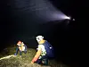 Lørdag var Sysselmannen og Røde Kors ute for å lete etter en italiensk turist som var savnet i fjellet. Her er en redningsmann fra Lufttransport og et medlem i Røde Kors Hjelpekors på vei ned til mannen som ble funnet ved Fuglefjella. I bakgrunnen ses «Polarsyssel» som var ute for å lyse opp fjellsiden da de lette etter mannen.